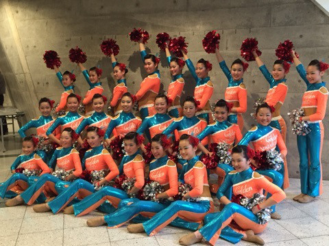 フロアに映えるオレンジとブルーの組み合わせはチアダンス衣装ならでは