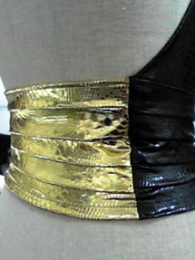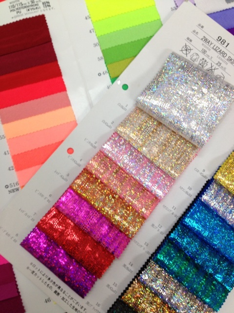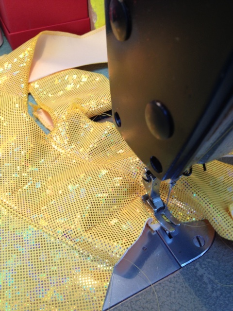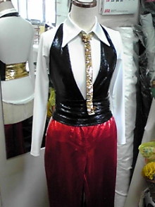 翌年、光沢のあるストレッチサテンにゴールドの生地を合わせたパンツを制作しました