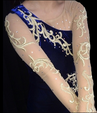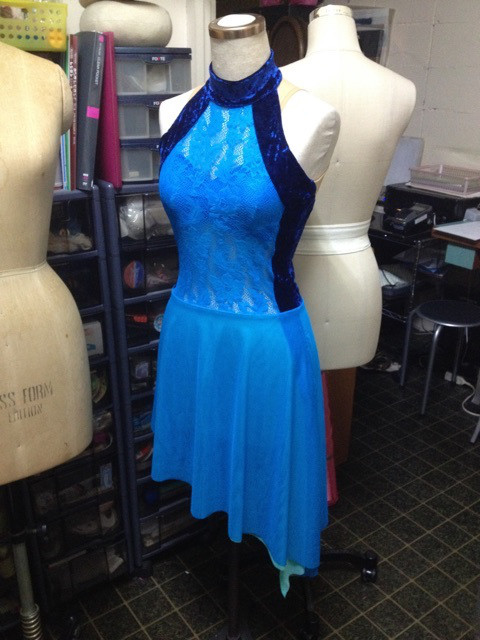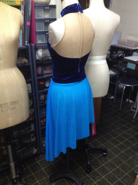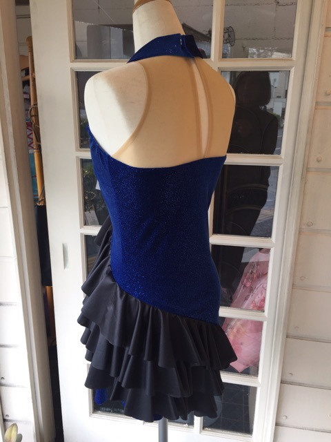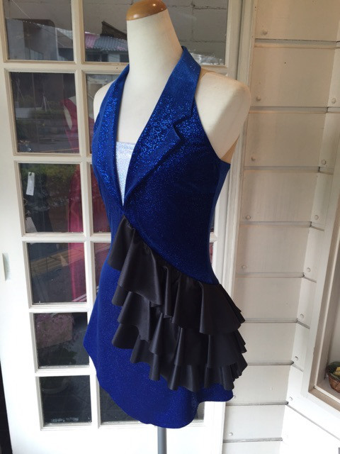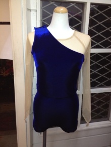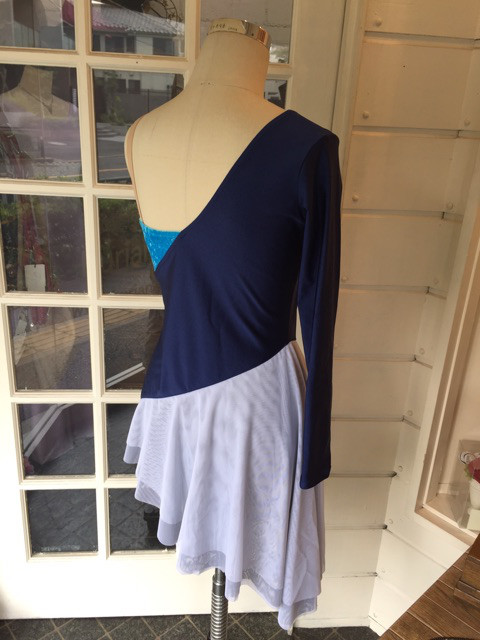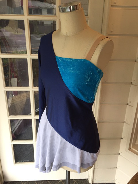 ネイビーブルーのベルベットの衣装、ワンショルダーの肩部分をはずすと